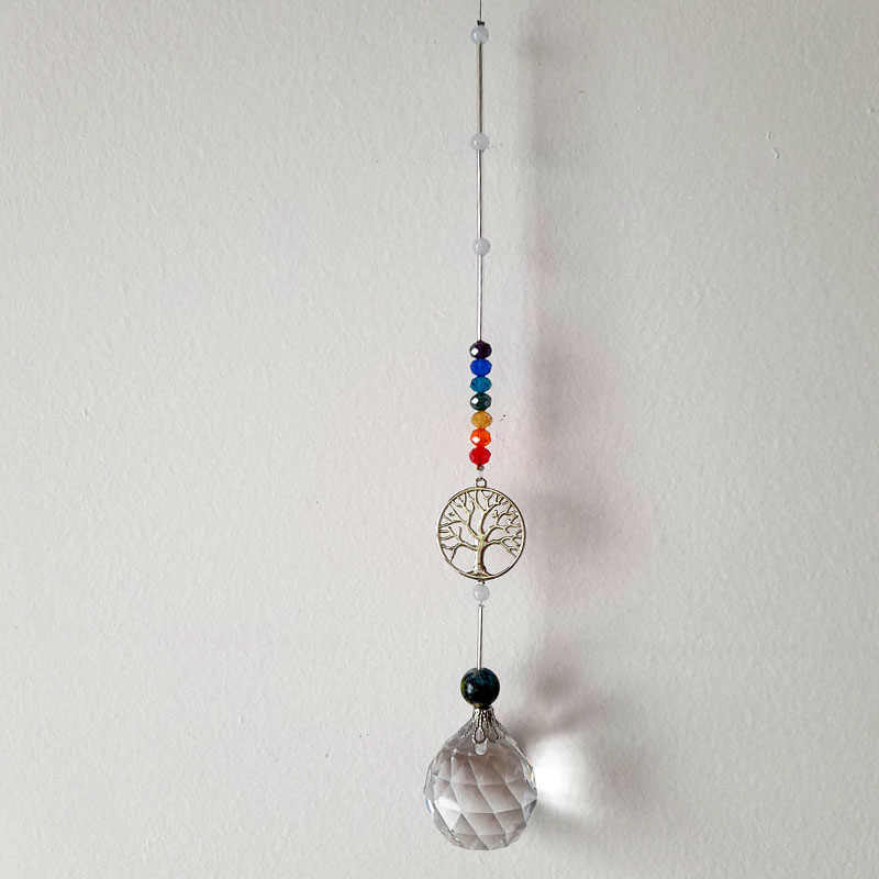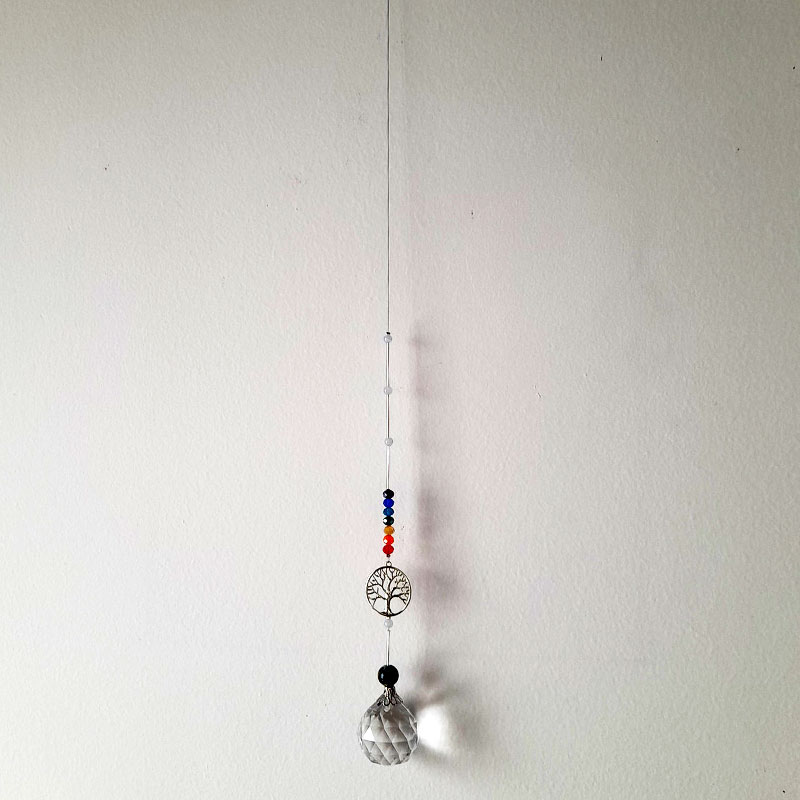 Los cristales de este colgante atrapan la luz solar y crean arcoíris que elevan la vibración del ambiente. Más allá de su belleza, aporta intenciones de paz y bienestar al hogar.