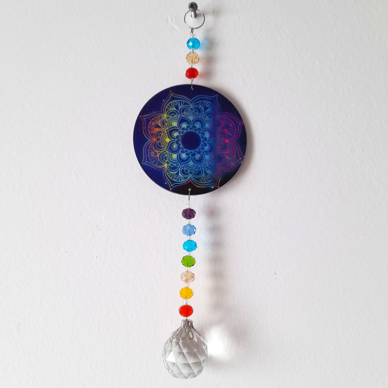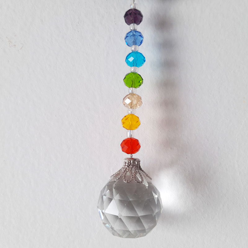 Los cristales de este colgante atrapan la luz solar y crean arcoíris que elevan la vibración del ambiente. Más allá de su belleza, aporta intenciones de paz y bienestar al hogar.
