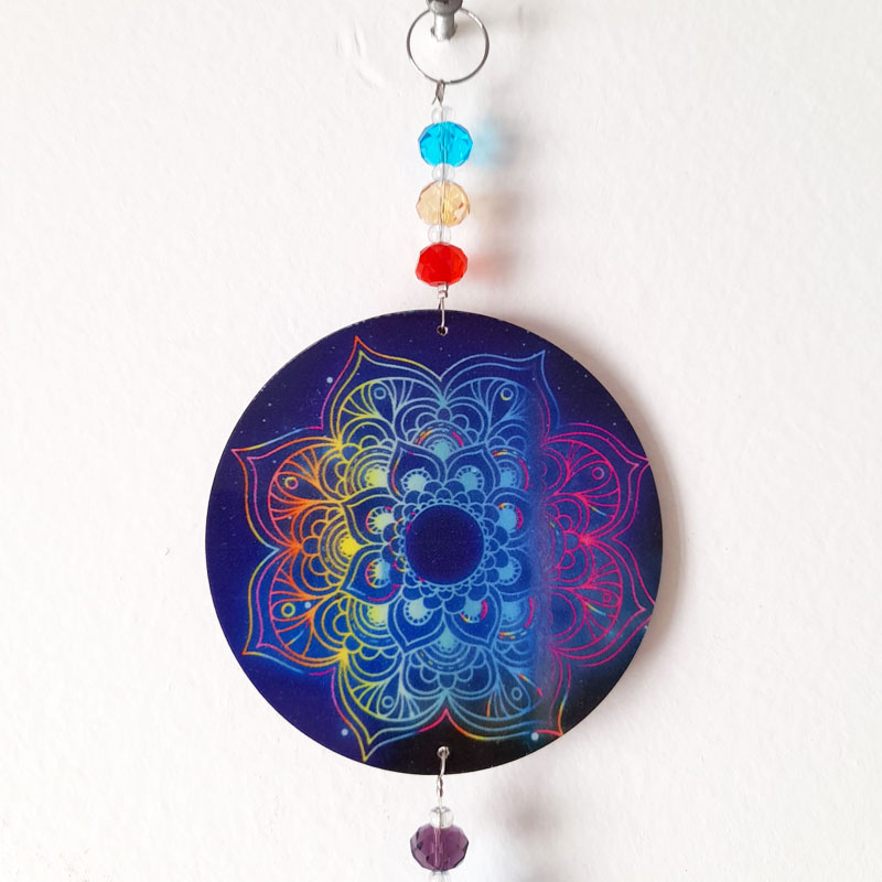 El Colgante Armonizador Atrapasoles Corto Mandala 7 chakras y Esfera de 3cm mide 26cm de largo total. A su vez, el colgante cuenta con los colores de los 7 chakras.