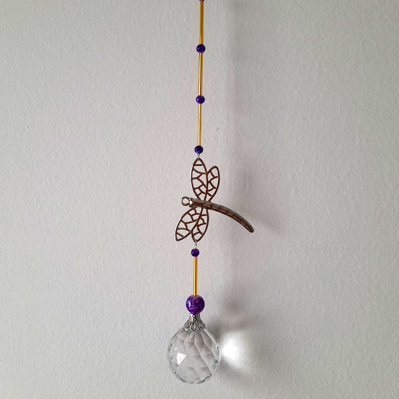 El Colgante Armonizador Atrapasoles Libélula con esfera de 4cm mide 55cm de largo total.
