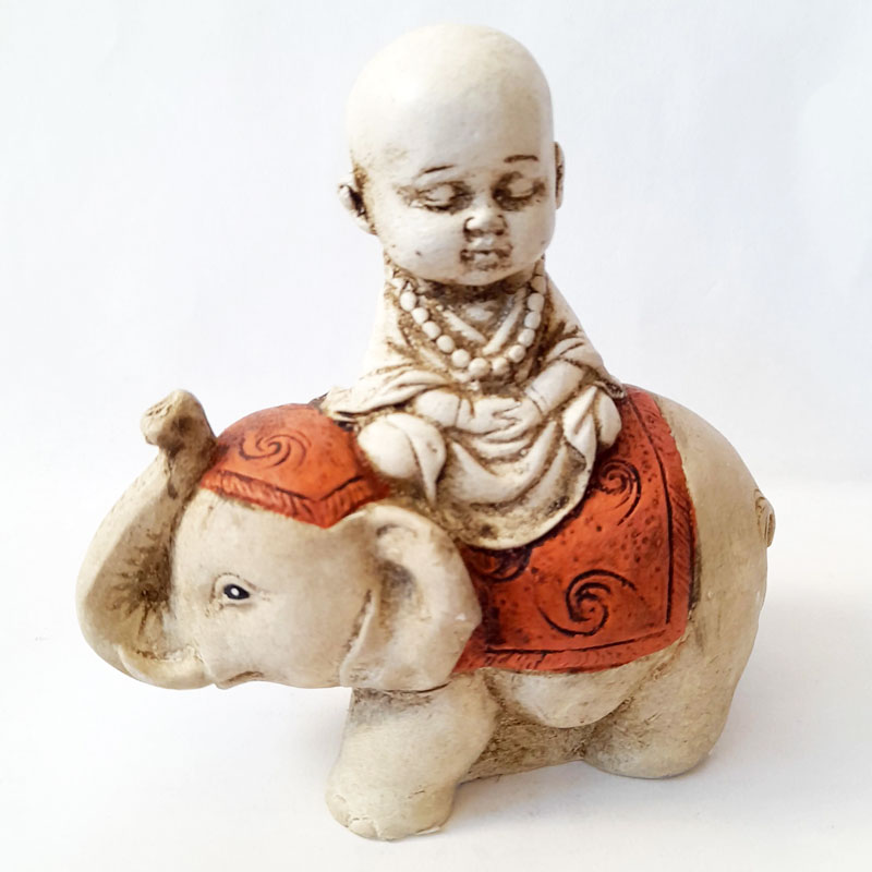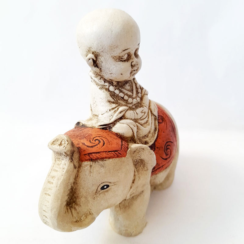 La Figura Buda sobre Elefante Manto Magenta mide 12cm de largo x 6cm de ancho x 12cm de alto.