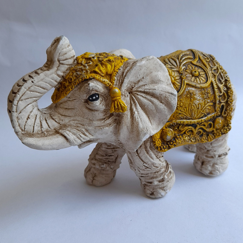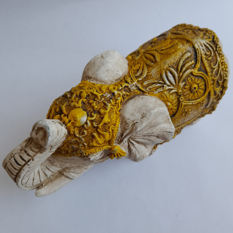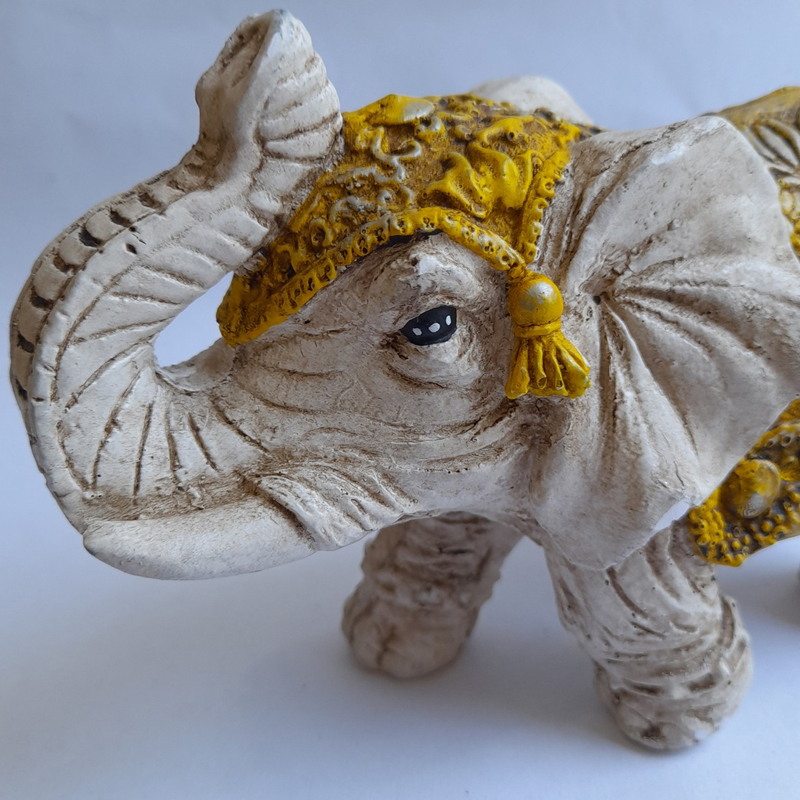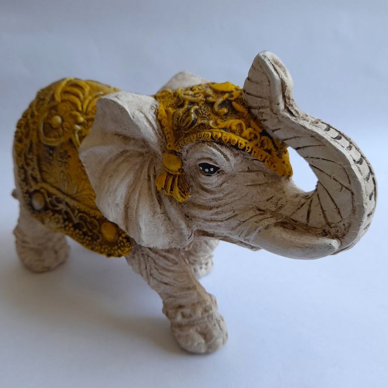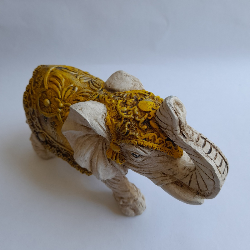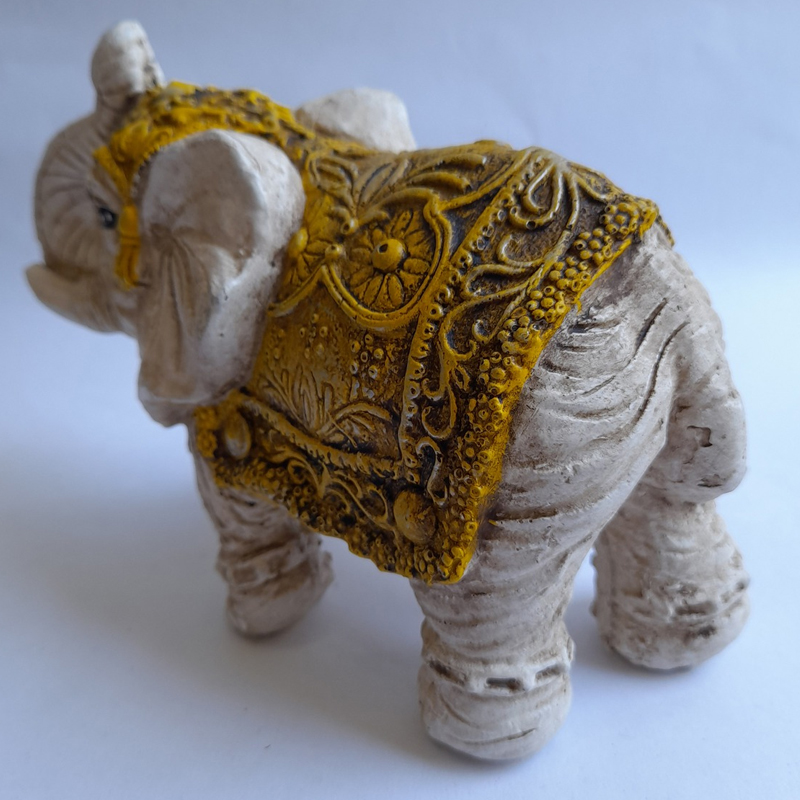 Esta figura de elefante de la India chico con manto amarillo mide 20x12x9cm.