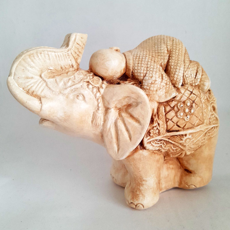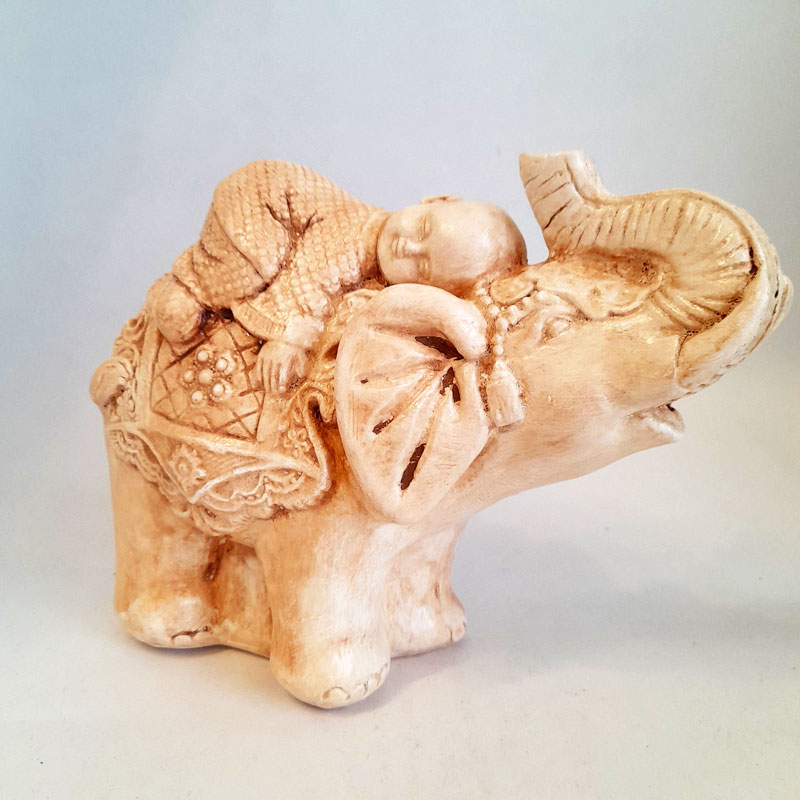 Esta figura de elefante de la India cuenta con un buda bebé descansando feliz en su lomo. Asimismo, la combinación de ambas figuras inspiran ternura y amistad.