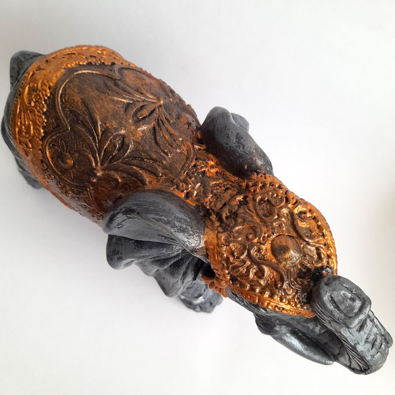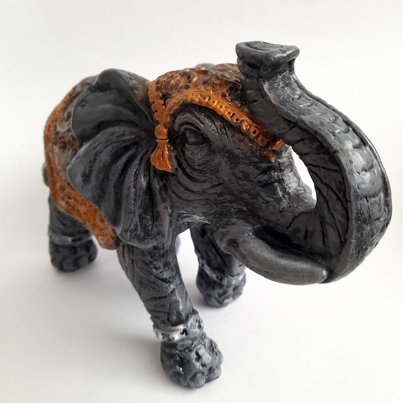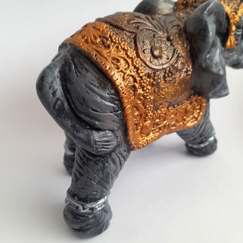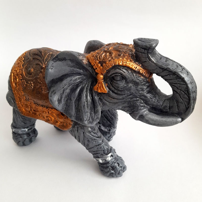 Esta figura de elefante de la India mediano con manto en diferentes tonalidades de color cobre mide 24x15x11cm.