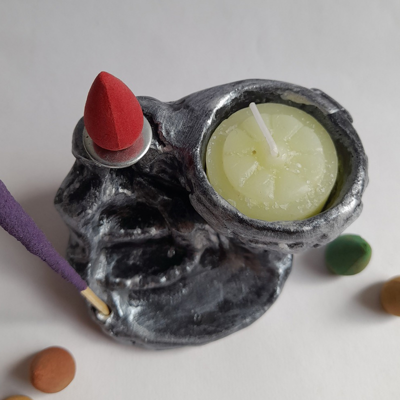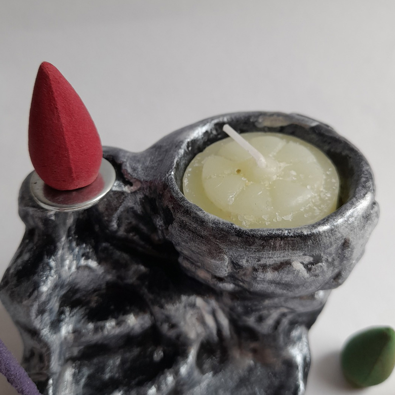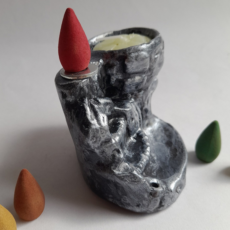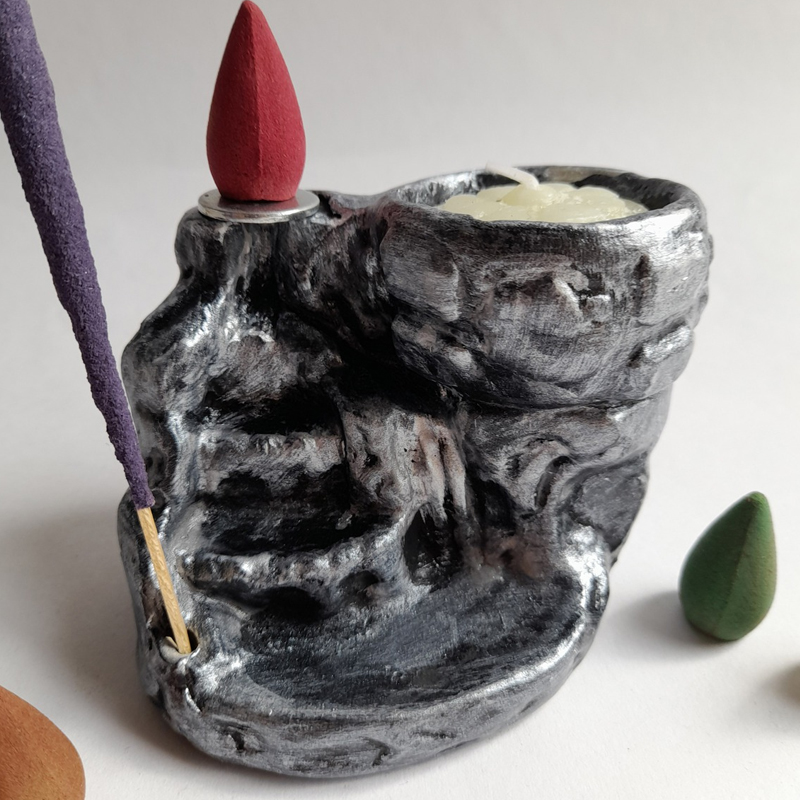 Este combo está compuesto por 1 fuente de humo con forma de Cascada en escalones con porta vela y porta sahumerio + 5 conitos aromatizados.