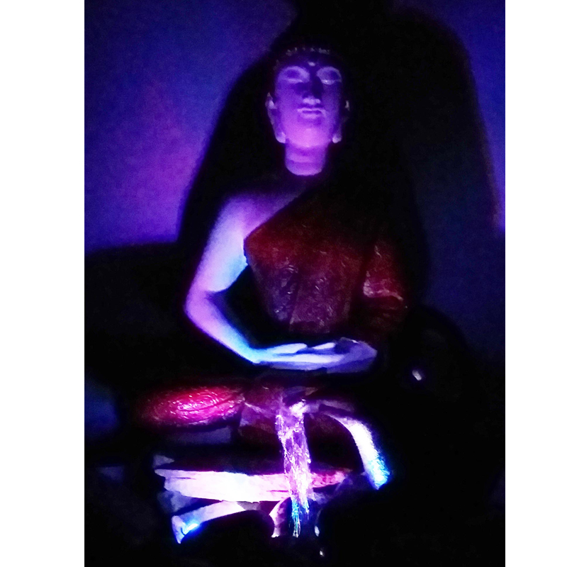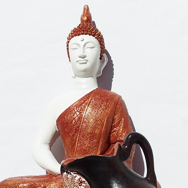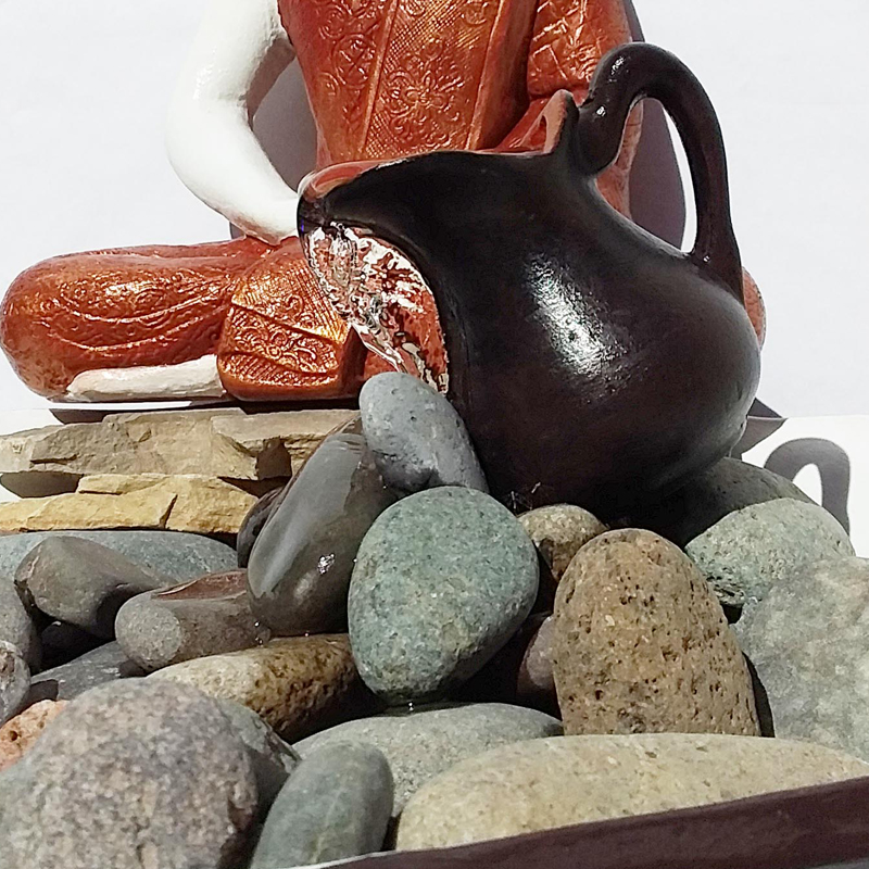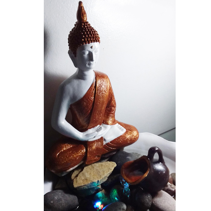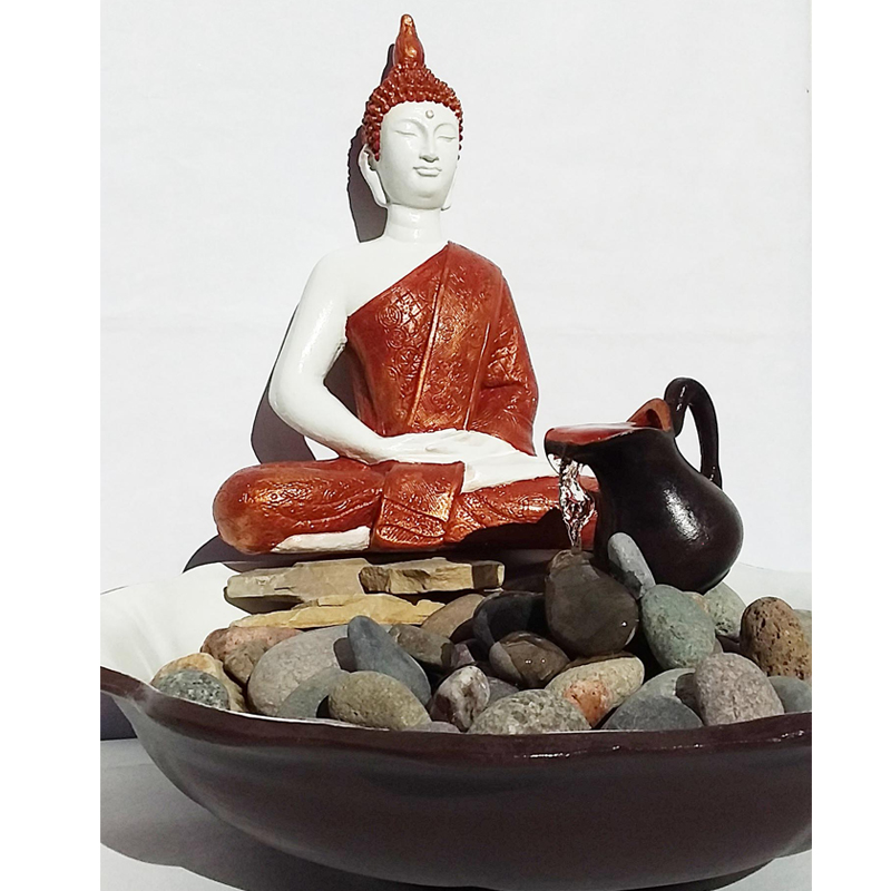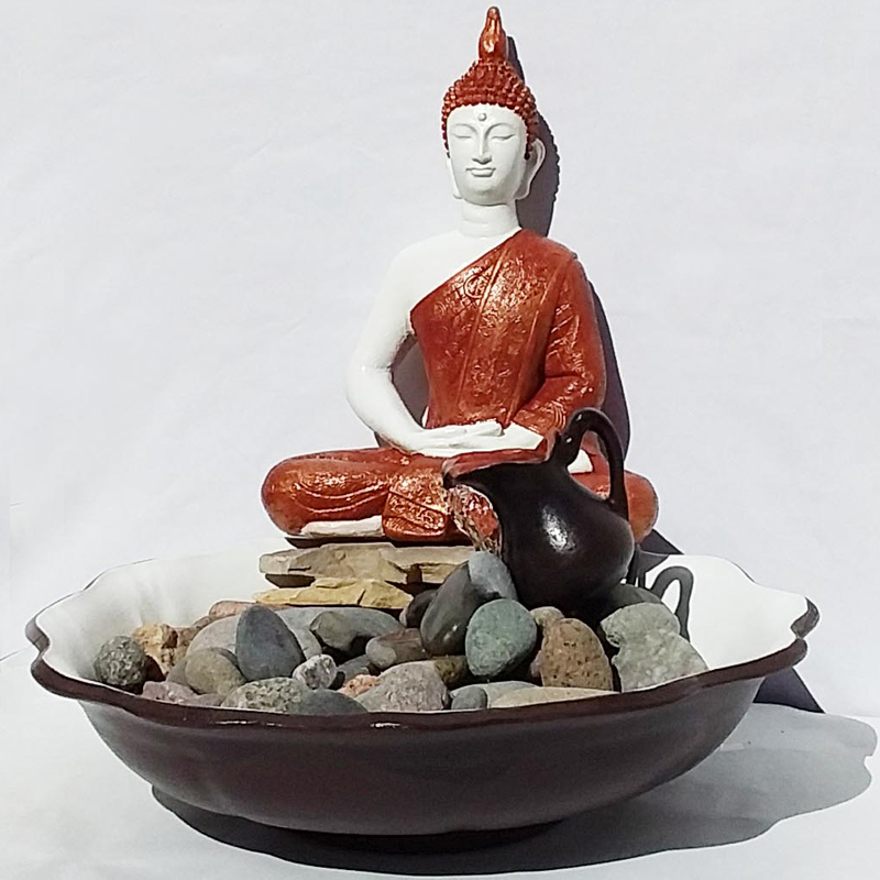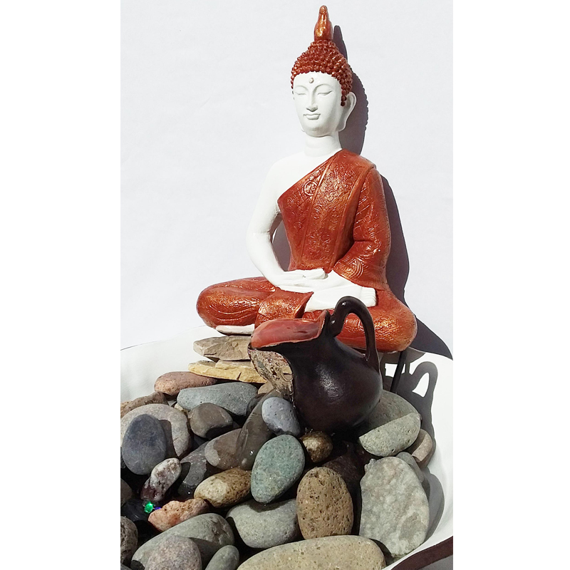 Esta Fuente de Agua Buda Meditación con Túnica de Cobre cuenta con un plato con diseño festoneado.
