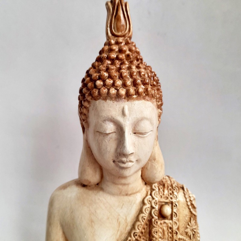 Asimismo, esta figura cuenta con un gran trabajo de detalle y representa el mudra Dhyana o postura de la meditación.