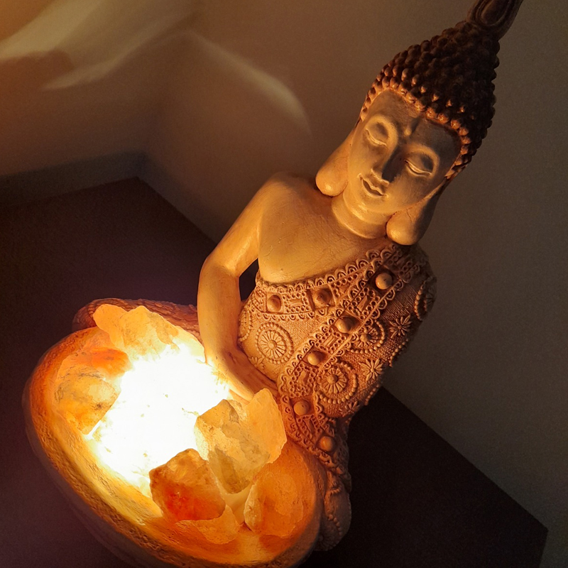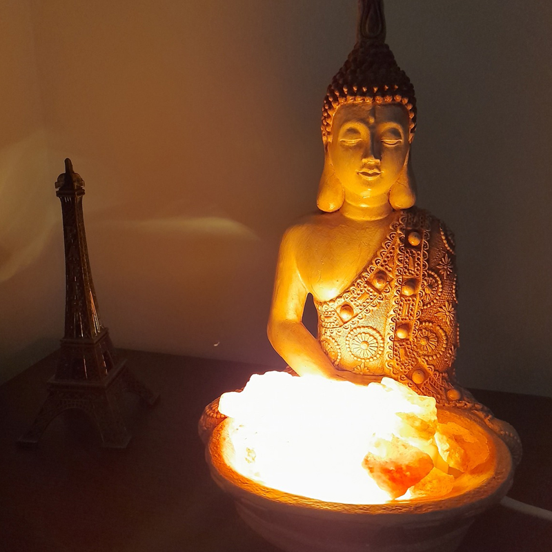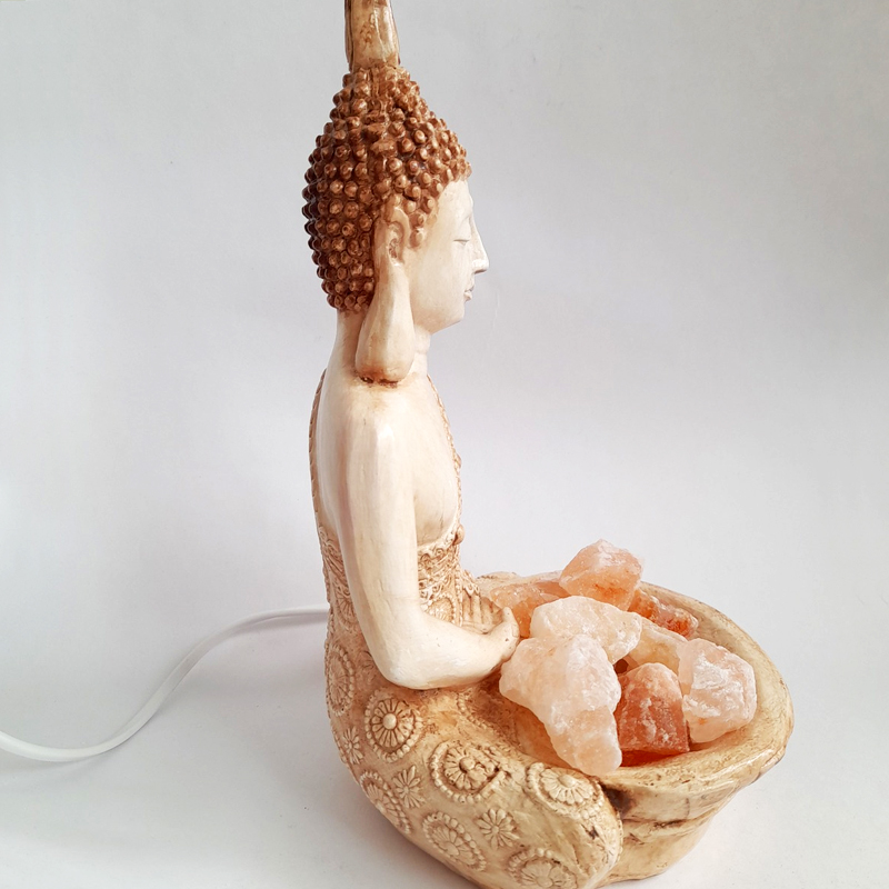 Esta lámpara de Sal del Himalaya Buda Manto Labrado mide 27cm de alto x 18cm de ancho x 15cm de largo. Está fabricado en color añejo pintado a mano.