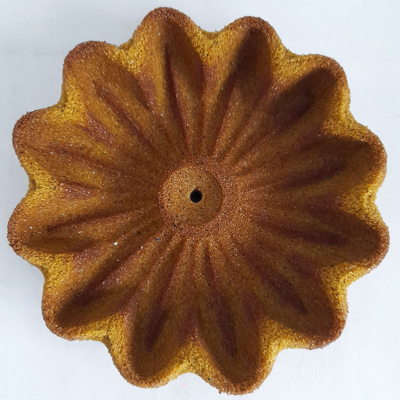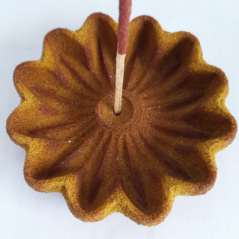 El porta sahumerio arena Flor mide 9cm de ancho x 2cm de alto. Se trata de un diseño veraniego en el cual se encuentra tallado cada uno de los pétalos de la flor en relieve.