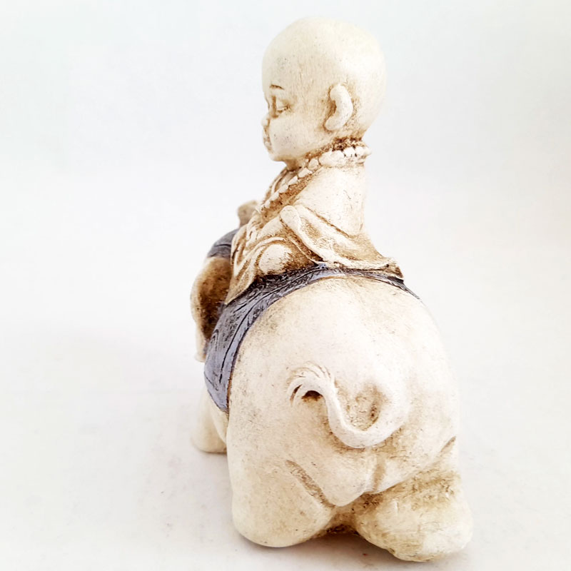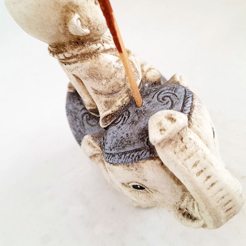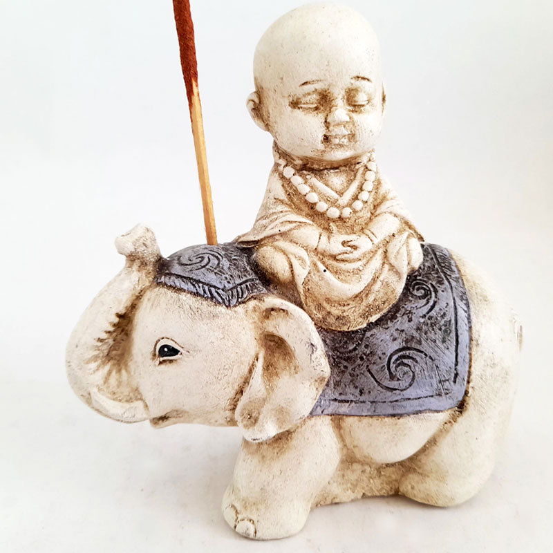 El Porta Sahumerio Figura Buda sobre Elefante Manto Lavanda mide 12cm de largo x 6cm de ancho x 12cm de alto.