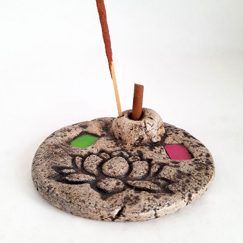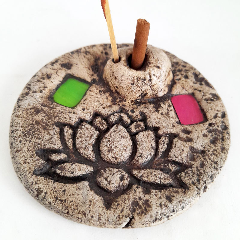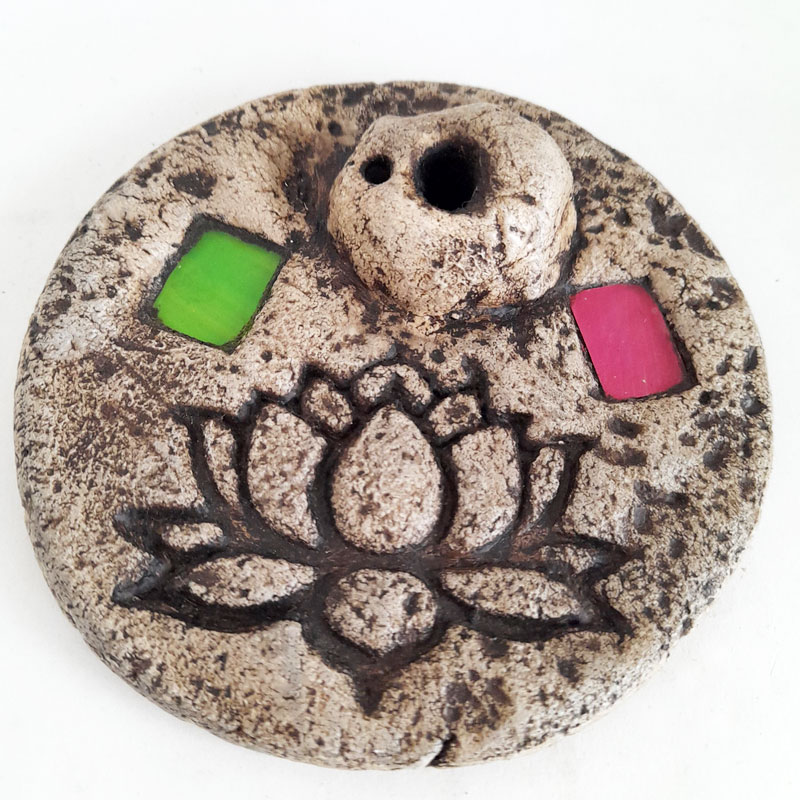 El Porta Sahumerio Porta Dhoop Flor de Loto Rosa y Verde cuenta con 1 orificio para ubicar sahumerios y 1 orificio para Dhoop (sahumerio sin palo). Es de diseño rústico y cuenta con 2 incrustaciones de cuadrados de vidrio de color.