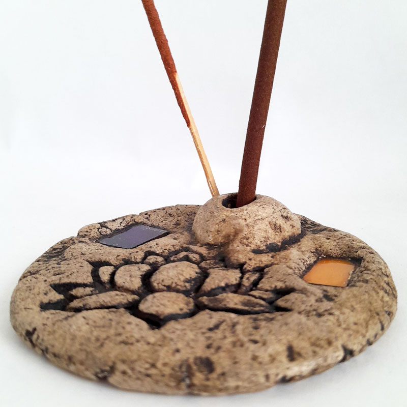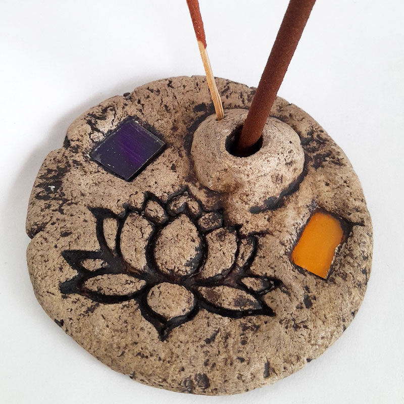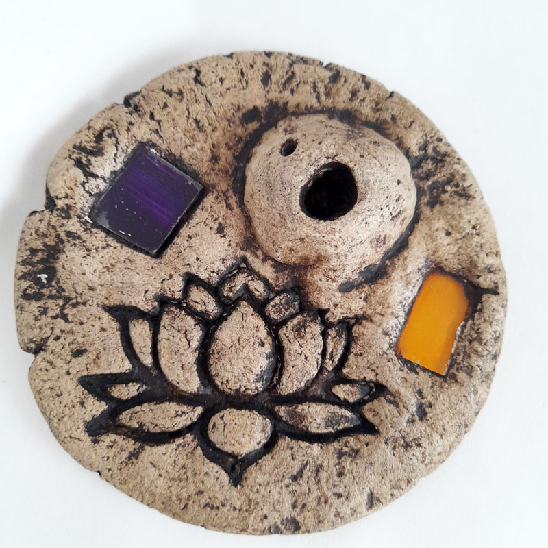 El Porta Sahumerio Porta Dhoop Flor de Loto Violeta y Amarillo cuenta con 2 orificios para ubicar sahumerios y 1 orificio para Dhoop (sahumerio sin palo). Es de diseño rústico y cuenta con 2 incrustaciones de cuadrados de vidrio de color.