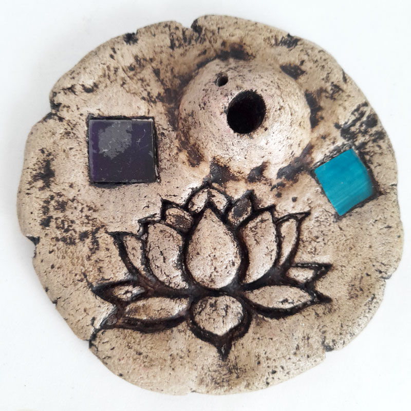 El Porta Sahumerio Porta Dhoop Flor de Loto Violeta y Celeste cuenta con 2 orificios para ubicar sahumerios y 1 orificio para Dhoop (sahumerio sin palo). Es de diseño rústico y cuenta con 2 incrustaciones de cuadrados de vidrio de color.