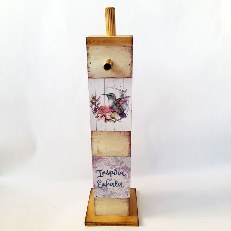 Este Porta Sahumerios en Torre con diseño vintage cuenta con la leyenda «Inspira y Exhala» y la figura de un colibrí.