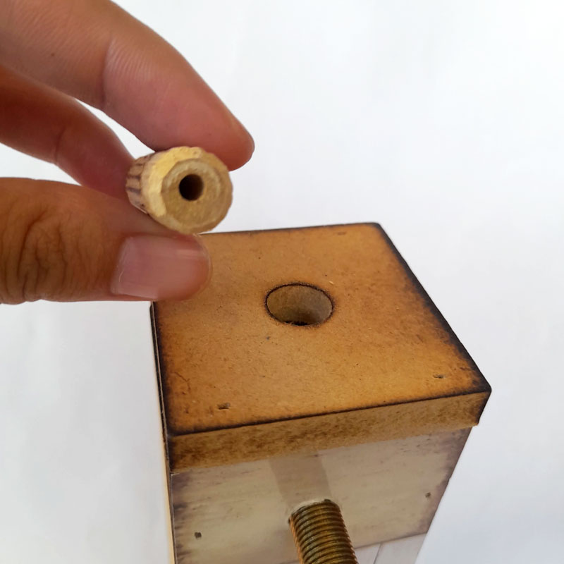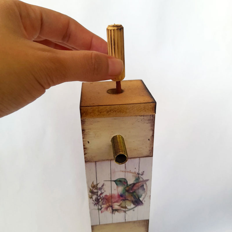 El sahumerio se ubica de manera invertida, utilizando el soporte de madera que se encuentra sobre la tapa del porta sahumerio.
