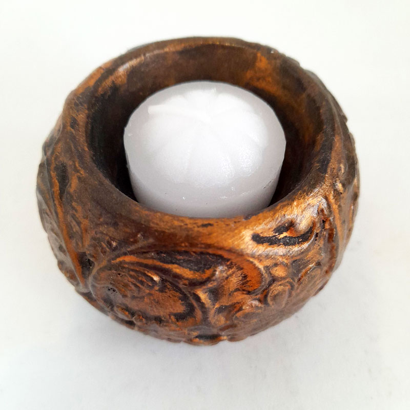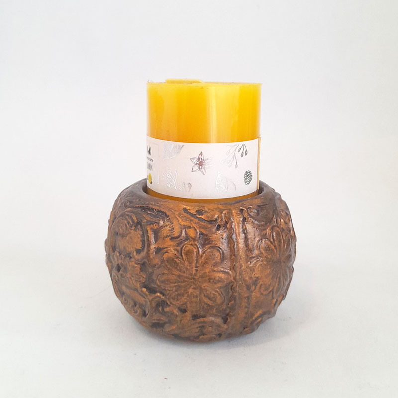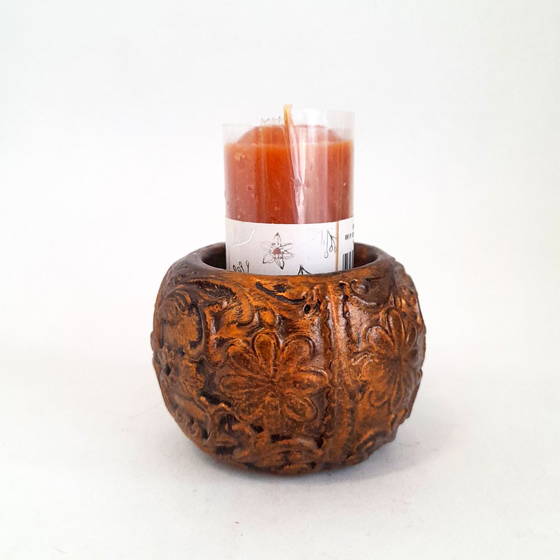 Este porta velas de yeso labrado cuenta con una terminación en cobre y un gran trabajo de detalle en sus dibujos tallados. Es ideal para decorar cualquier espacio.