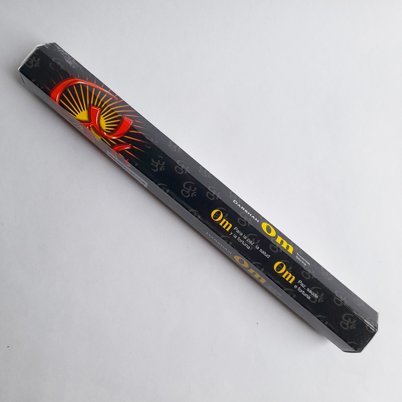 Esta caja contiene 20 unidades de varilla de sahumerio Om Rojo Darshan importado de la India para la paz, la salud y la fortuna.