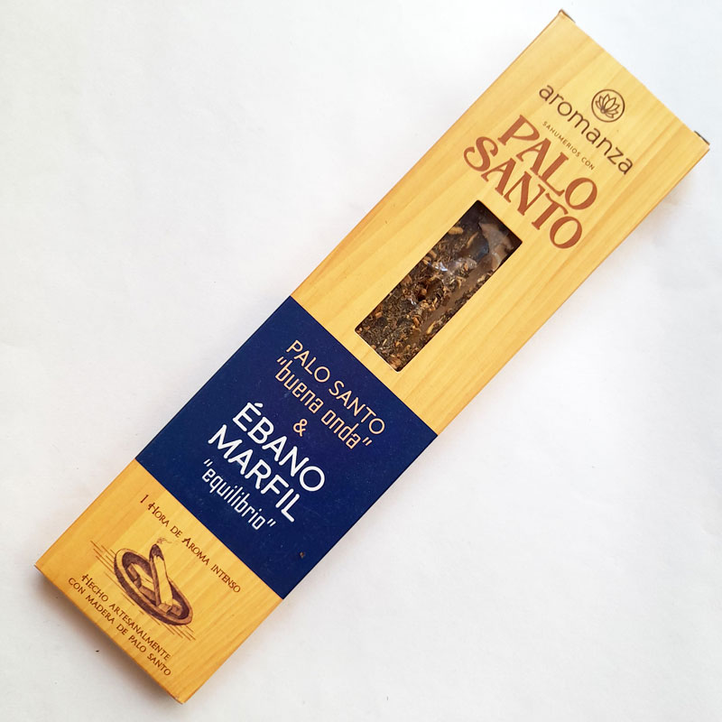 La caja de Sahumerio de Palo Santo con Ébano Marfil Aromanza pertenece a la línea «Buena Onda», contiene 8 varillas gruesas. Contribuye a brindar equilibrio en la vida.