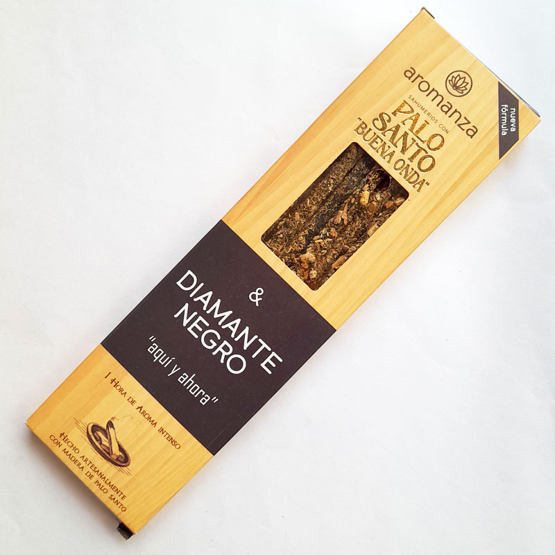 La caja de Sahumerio de Palo Santo y Diamante Negro Aquí y Ahora Aromanza pertenece a la línea «Buena Onda», contiene 8 varillas gruesas.