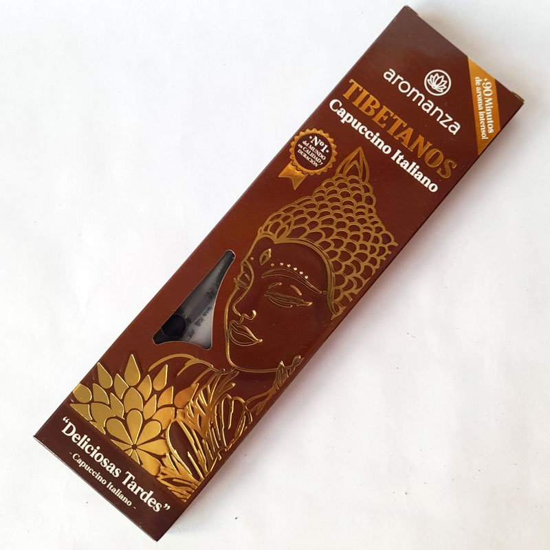 La caja de Sahumerio Tibetano Capuccino Italiano Deliciosas Tardes Aromanza contiene 8 varillas gruesas extra fuertes.