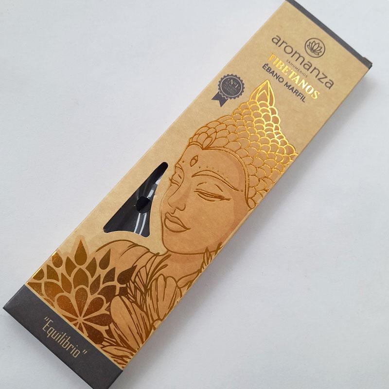La caja de Sahumerio Tibetano Ébano Marfil Equilibrio Aromanza contiene 8 varillas gruesas extra fuertes.