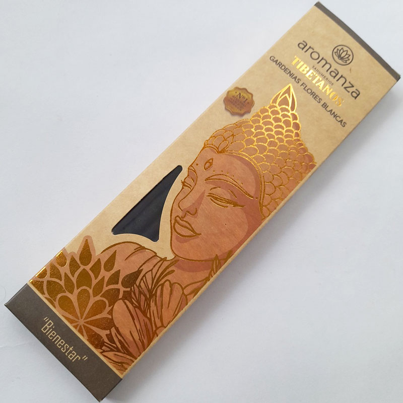 La caja de Sahumerio Tibetano Gardenias Flores Blancas Aromanza contiene 8 varillas gruesas extra fuertes.