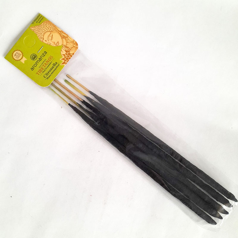 La bolsa de Sahumerio Tibetano Pack Económico Citronella Aromanza contiene 5 varillas. Este aroma cítrico mata mosquitos emana una fragancia fresca con notas vivaces de limón y hierbas.