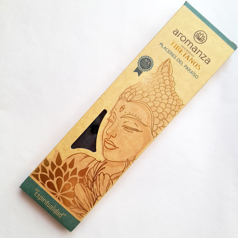 La caja de Sahumerio Tibetano Placeres del Paraíso Espiritualidad Aromanza contiene 8 varillas gruesas extra fuertes.